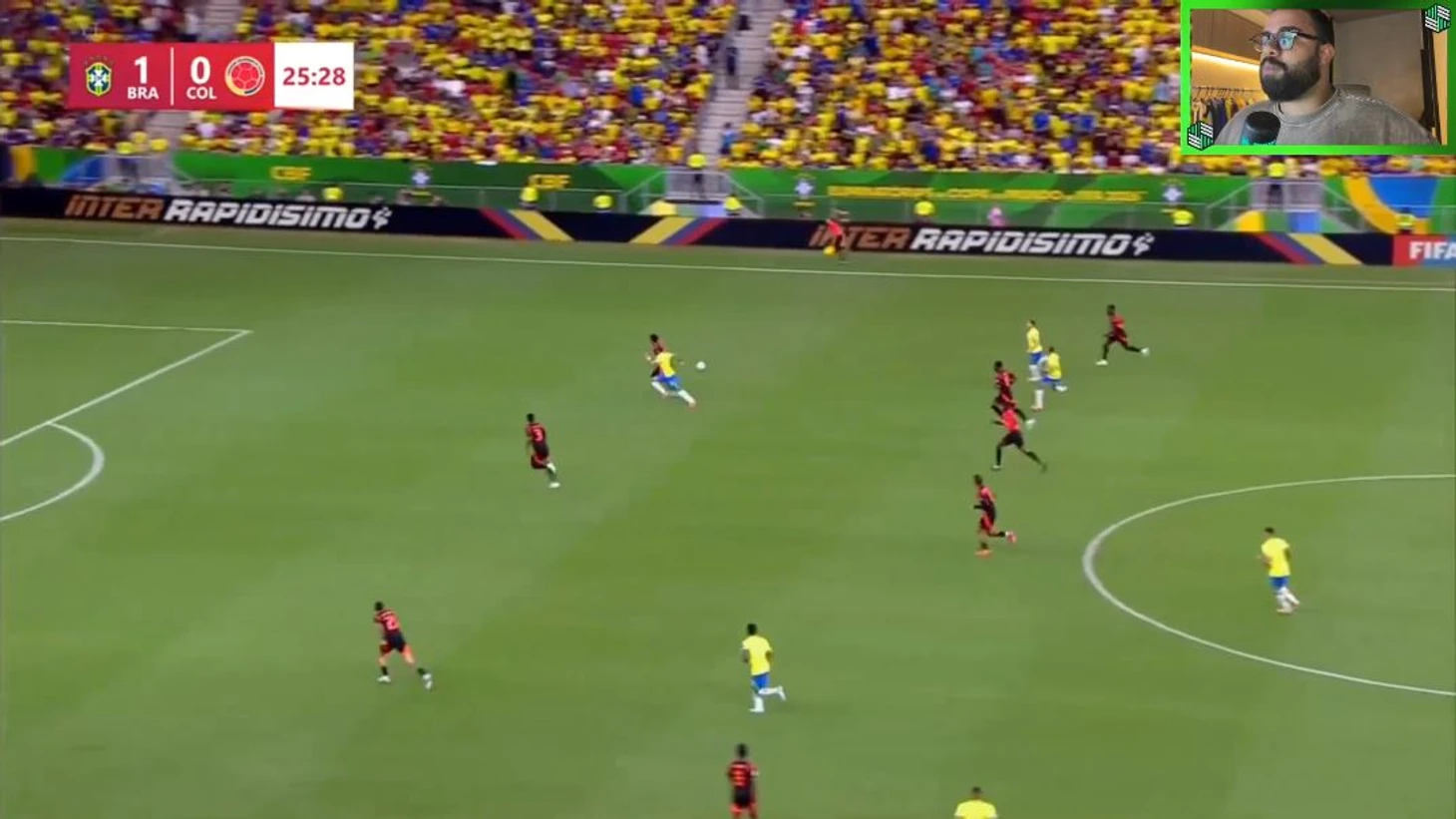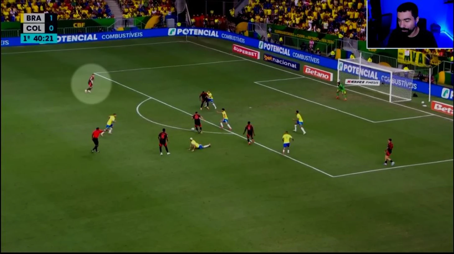 Вместо Жерсона вышел Жоэлинтон, который и близко не обладает такими же способностями держать мяч, преодолевать опеку при приеме мяча спиной к воротам соперника и контролировать ритм игры. Его стихия – беги, борись, прессингуй и выходи на пространство. В этой же игре Биг Жо логично потерялся в созидании и довольно долго соображал при опеке соперника. Именно он был накрыт Ариасом на границе бразильской штрафной, что привело к голу, забитому Луисом Диасом на 40-ой минуте.