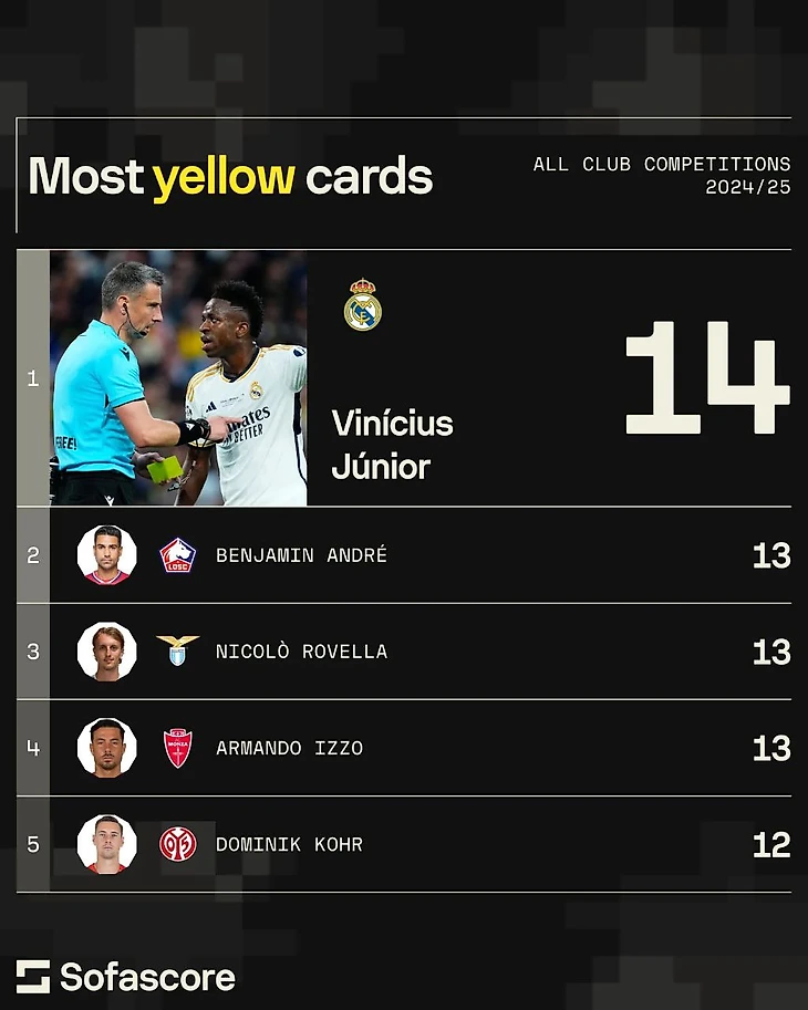 Наткнулся на забавную статистику. Вини-то оказывается лидирует в Европе…по желтым карточкам. Винисиус Ковтун какой-то. Интересно, из этих 14 наверное штук 10 за споры, провокации и затяжки времени или больше?