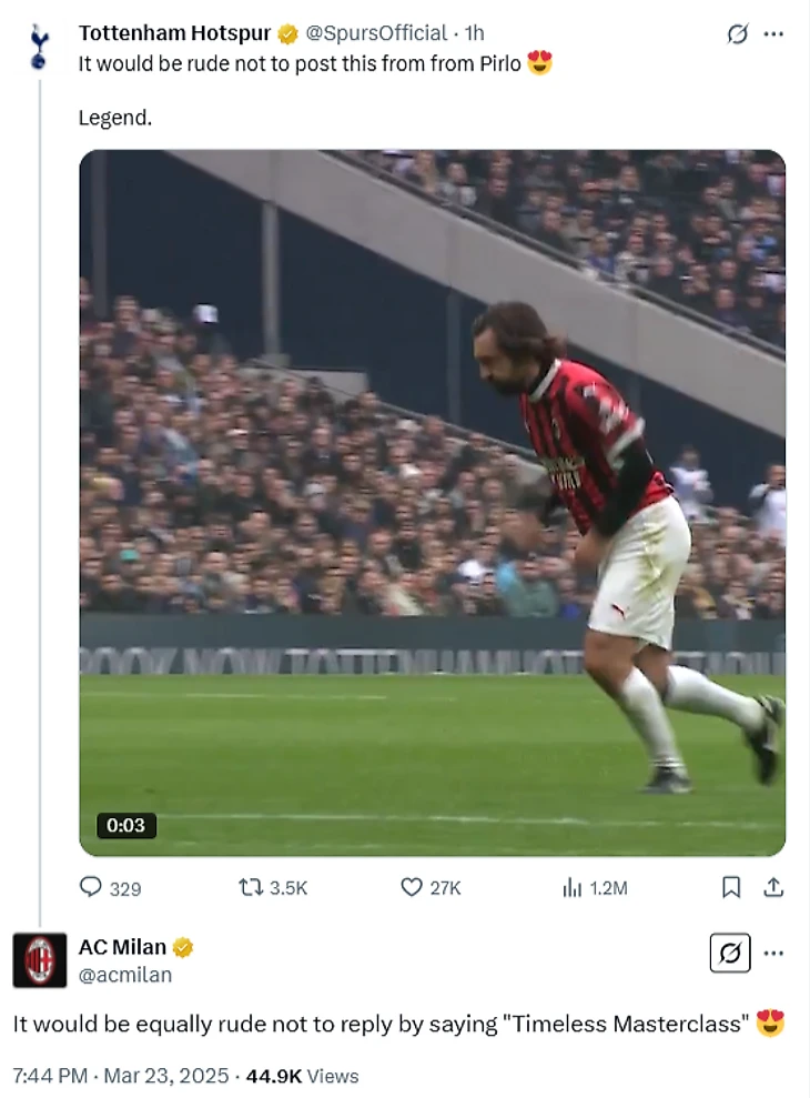 🎥 Волшебный гол Пирло со штрафного в матче легенд «Милана» и «Тоттенхэма». Восхитил даже официальный аккаунт «шпор»