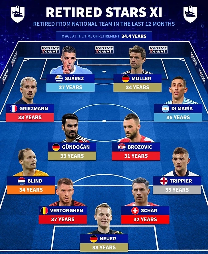 Портал составил символическую команду из игроков, которые завершили международную карьеру в последние 12 месяцев. В состав попали лишь те футболисты, которые продолжают выступать за клуб, поэтому здесь, например, нет Тони Крооса.