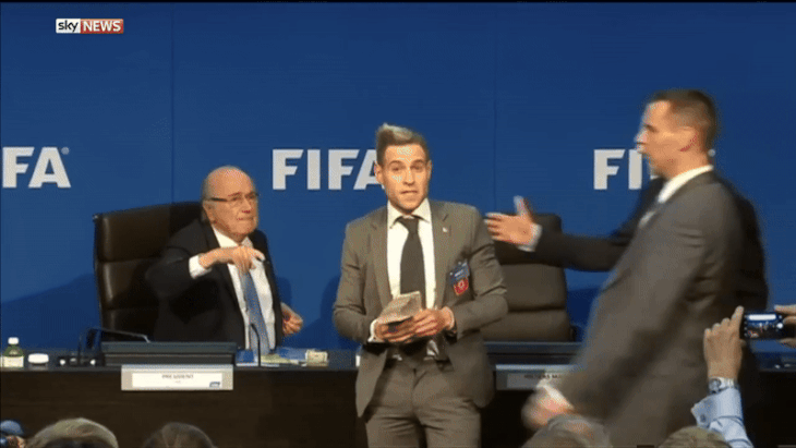 Он критиковал идею расширения ЧМ и призвал европейские страны принять лимит на легионеров «6+5», как на тот момент в России ради роста талантливых футболистов в сборных. Тогда на пресс-конференции в Блаттера полетели купюры – их бросил британский комик Ли Нельсон.