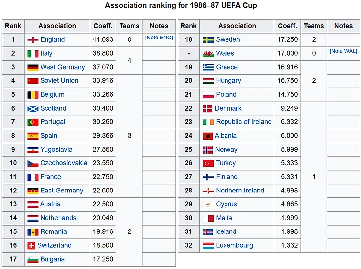 Для Кубка УЕФА количество слотов, предоставленных чемпионату каждой страны, определялось коэффициентом страны в рейтинге УЕФА. Англия была на первом месте в то время и получила четыре места. Мы знаем, что после запрета эти четыре места были перераспределены между четырьмя странами с более низким рейтингом, у которых было только по два слота у каждой. Этими странами были, в порядке убывания рейтинга УЕФА: Югославия, Чехословакия, Франция и Восточная Германия (ГДР).