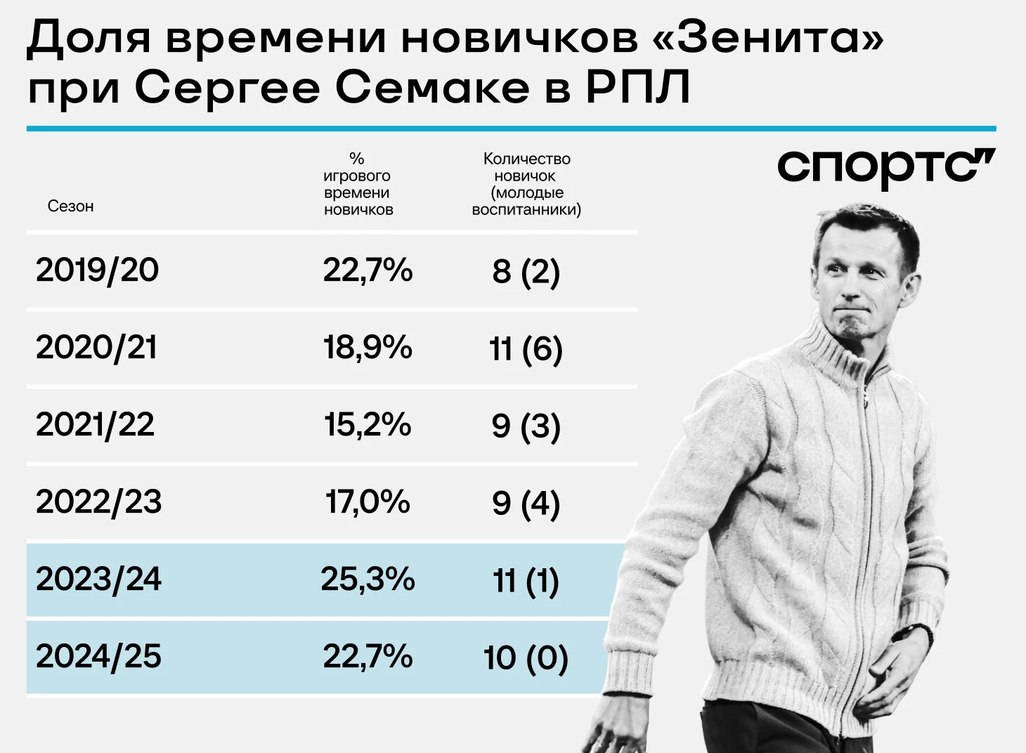 Существенные кадровые изменения в «Зените» заметны и по игровому времени новичков при Семаке. Так много, как в последние два сезона, они играли только во втором сезоне Семака, когда «Зенит» еще расчищал наследие Мирчи Луческу и Роберто Манчини и только подписал Малкома, Дугласа Сантоса, Вячеслава Караваева, Алексея Сутормина и Данила Кругового.
