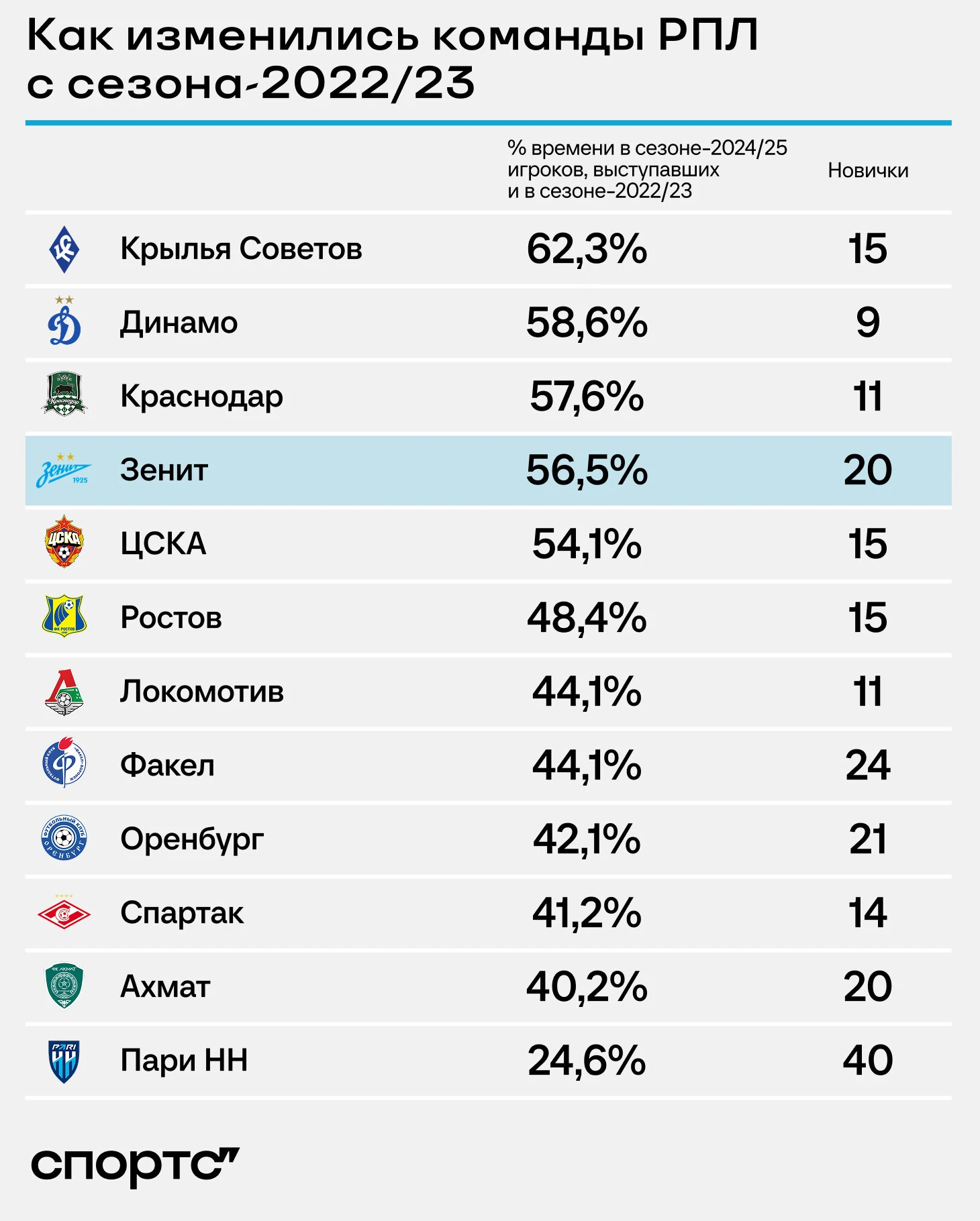 Несмотря на 20 новичков за четыре окна, основа «Зенита» кардинально не изменилась. В этом сезоне по доле игрового времени футболистов, выступавших еще в сезоне-2022/23, «Зенит» занимает четвертое место – при этом отставание от «Динамо» и «Краснодара» минимально. Другие клубы, номинально обновившиеся на (количественном) уровне «Зенита», задействуют старичков гораздо реже.