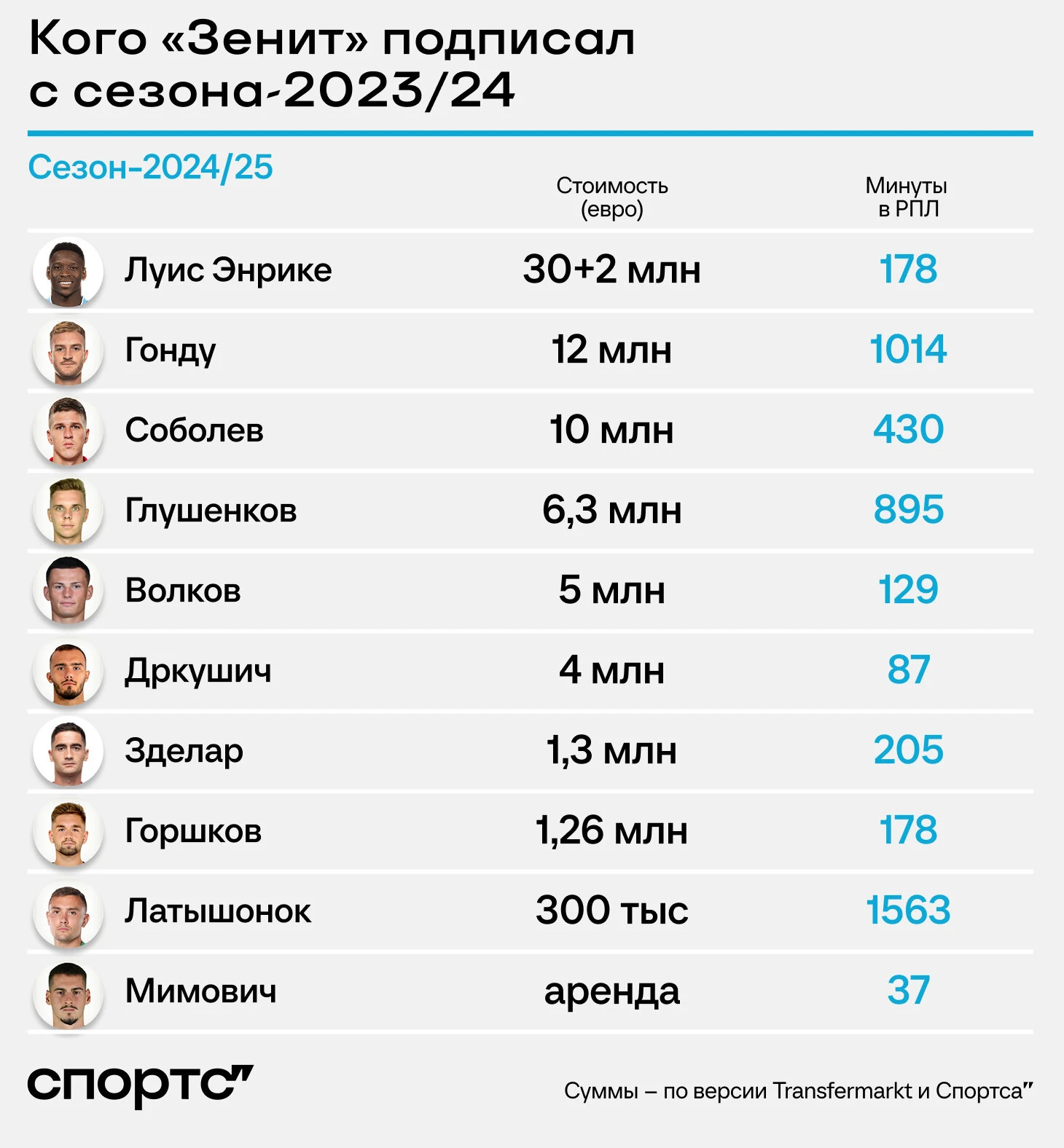 Зимой 2024-го на правый фланг атаки «Зенит» подписал Артура, который должен был закрыть дыру, образовавшуюся после ухода Малкома. Артур провалился – летом 2024-го на его место приехал Максим Глушенков. Через два месяца подписали Гонду, тоже умеющего играть справа. Через полгода – Луиса Энрике, для которого это вообще основная позиция.