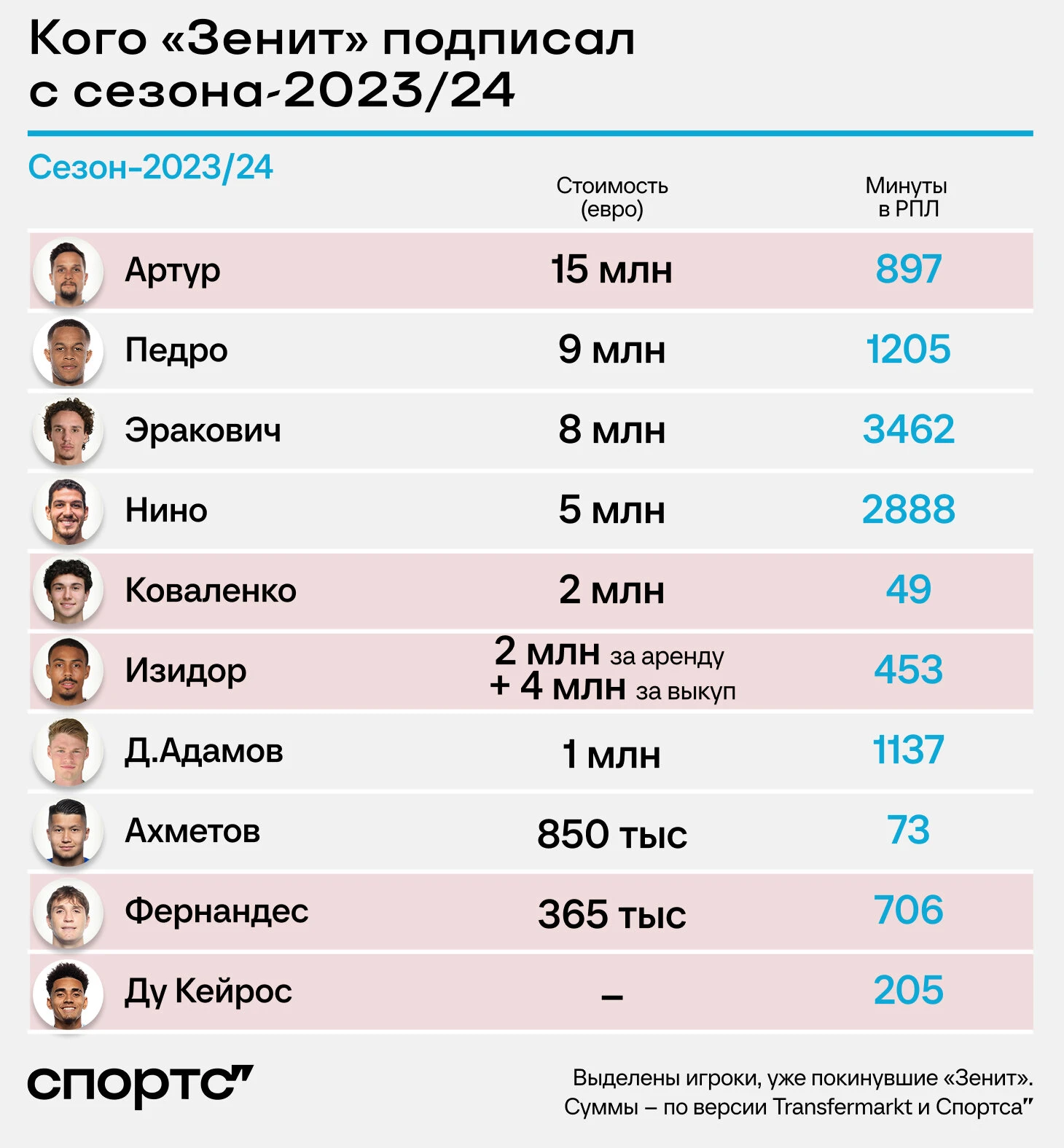 За последние четыре трансферных окна «Зенит» подписал 20 игроков – это четвертый-пятый показатель в лиге (больше у «Пари НН», феноменальные 40, у «Факела» – 24, у «Оренбурга» – 21) и первый – с огромным отрывом – среди топ-клубов. ЦСКА купил 15 футболистов, «Спартак» – 14, «Краснодар» и «Локомотив» – по 11, «Динамо» – 9.