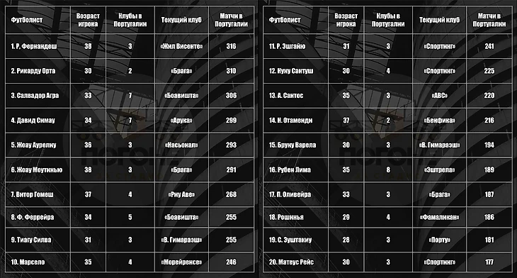 Зато в списке топ-20 в Португалии выделяется защитник «Эштрелы» Рубен Лима, поигравший в восьми разных клубах португальской лиги, при этом не сыграв и 200 матчей в Чемпионатах Португалии. Лима – воспитанник футбольной академии «Бенфика», где прошел обучение и начал профессиональный путь, но за основной состав так и не сыграл.