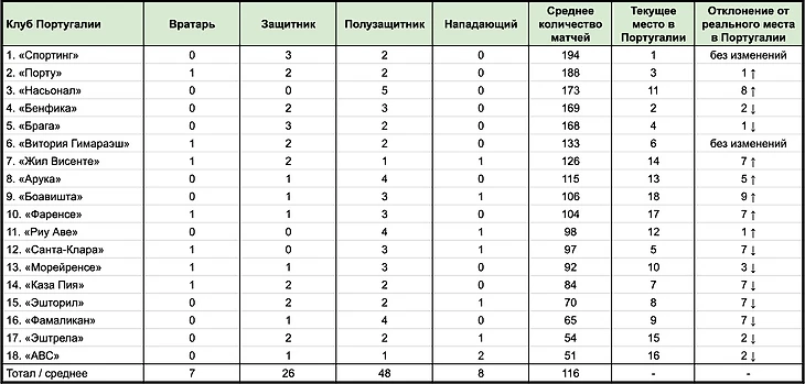 В последнем столбце посчитал отклонение рейтинга относительно текущей позиции клуба в таблице Португалии, чтобы проследить, есть ли закономерность: костяк в команде дольше играет – команда выше в таблице.