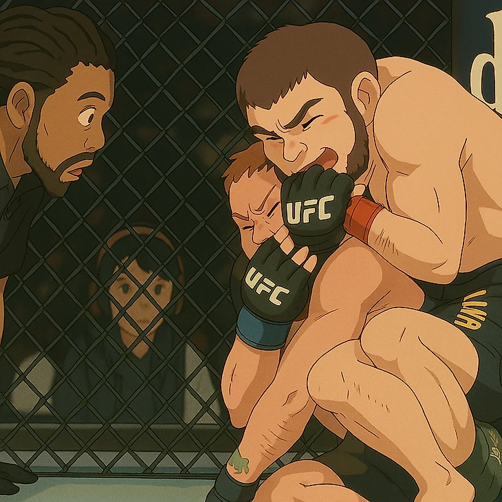 Через несколько секунд Хабиб закончит бой, наорет на Макгрегора и полетит в зал.