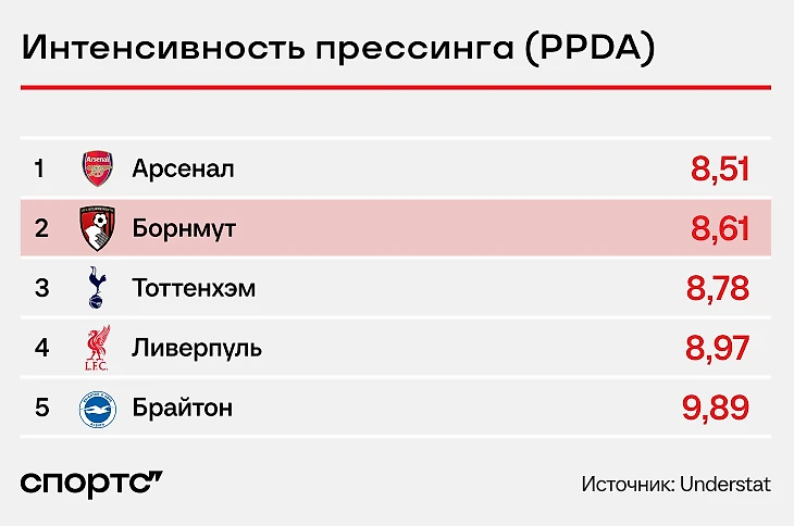 Андер Мурильо – бывший одноклубник и спортивный директор, который первым доверился Ираоле (пригласил в кипрский АЕК) – называет стиль Андони «рок-н-ролльным». Главный инструмент команд такого типажа – прессинг. Именно с его помощью «Борнмут» навязывает удобный рисунок матчей. Команда Ираолы претендует на звание лучшей прессинг-машины АПЛ-2024/25. Одной метрики, которая рассказала бы о давлении абсолютно все, нет, но «Борнмут» выделяется во всех направлениях.