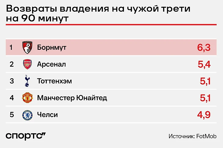 После 23 туров The Athletic выкладывал данные по пропорции ударов, которые умещаются в первые 10 секунд после возврата мяча. «Борнмут» – лидер с отрывом:
