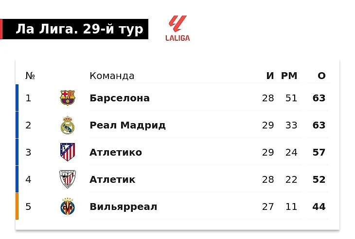 Дела в Ла Лиге: у «Барсы» и «Реала» по 63 очка, но каталонцы еще не играли свой матч против «Жироны». «Атлетико» отстает от лидеров на шесть.