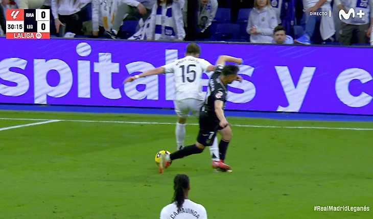 «Реал» перевернул игру и повел 3:2, а в конце чуть сам не получил пенальти: когда Рауль Асенсио ударил по ногам форварда Яна Диоманде. Но арбитр Фуэртес не увидел фола: похоже, до этого испанец все-таки коснулся мяча. Хотя по повторам кажется, что просто махнул мимо, и мяч прилетел в ногу после касания форварда «Леганеса». Но ВАР проверил, посчитали момент легальным.