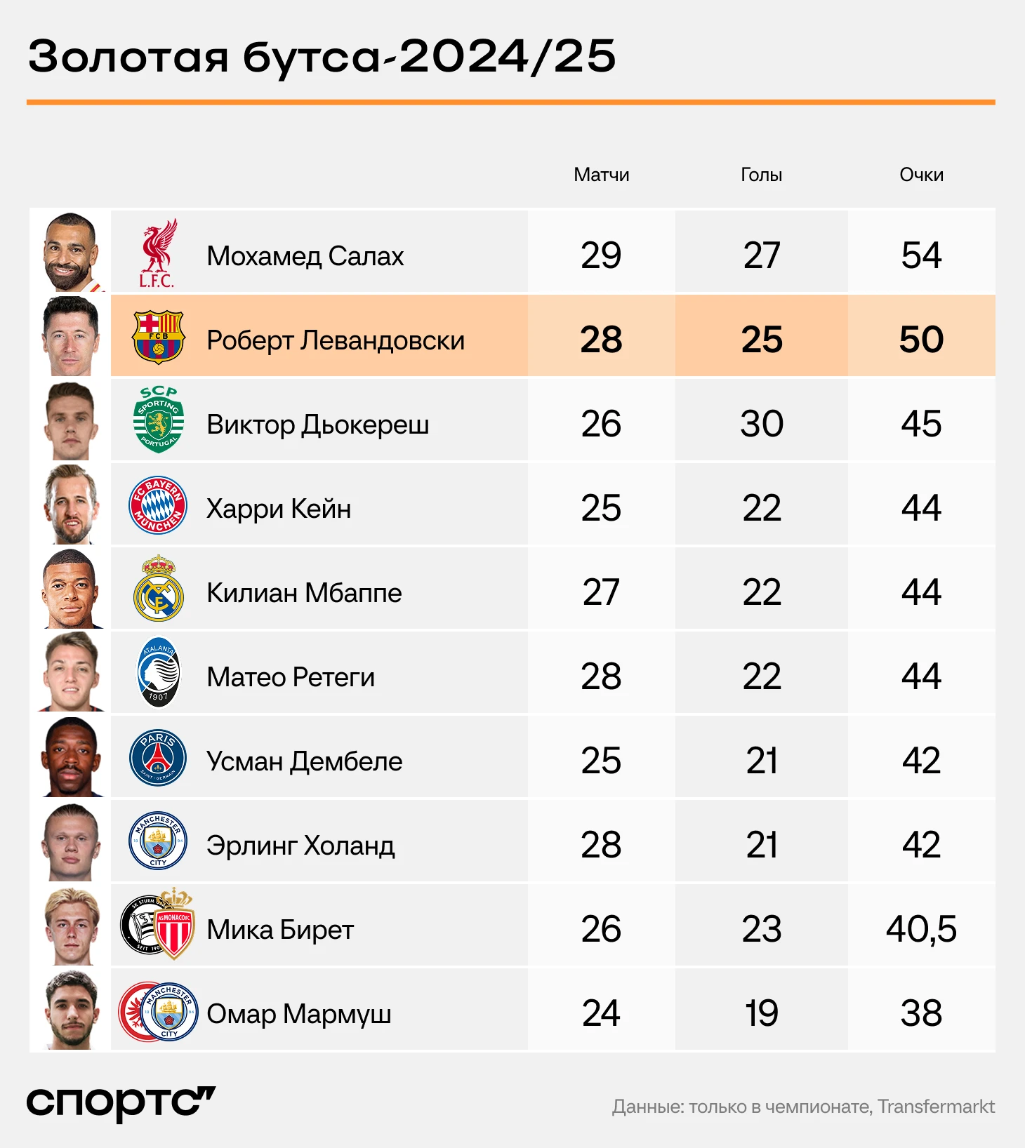 Если в Ла Лиге у Левандовского есть голевой отрыв, то вот в гонке за «Золотую бутсу» он только второй – после Мохамеда Салаха. Учитываются голы только в чемпионате, с учетом ЛЧ и кубков Роберт был бы лидером с весомым отрывом. Однако даже так отстал всего на четыре очка.