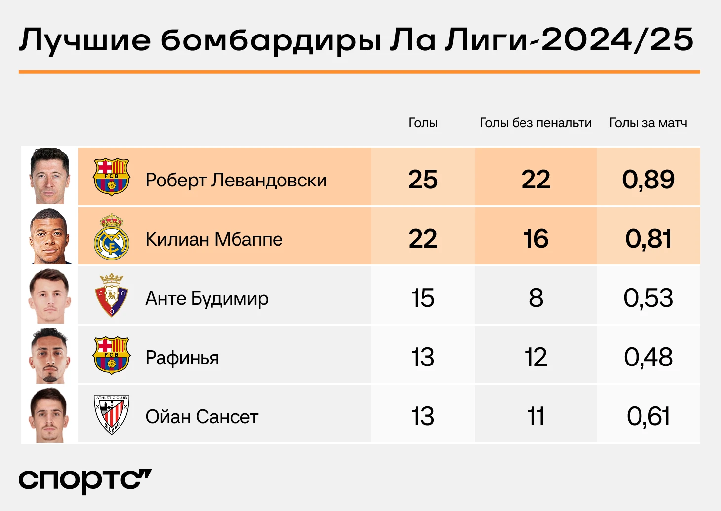 Ладно, ограничимся только Ла Лигой. За Левандовским гонится Килиан Мбаппе, пока даже с шестью пенальти отстает – на три мяча.