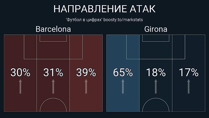 Справа игра «Жироны» была сильно ориентирована на сдерживание, поэтому наибольшая часть угрозы и атак гостей пришлась на левый край (65%).