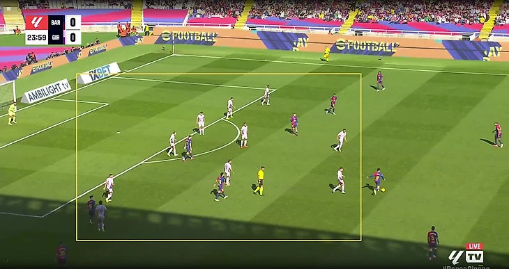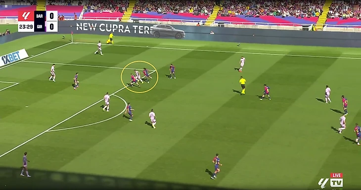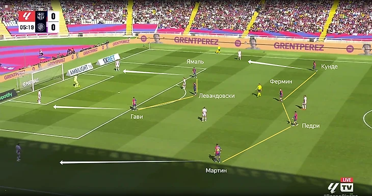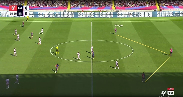 В первой линии могут быть вариации. Например, против «Осасуны» на одной высоте с Ямалем располагался центральный нападающий Торрес. Против «Жироны» Левандовски, который также вышел на этой позиции, действовал уже ниже и ориентировался на опорного полузащитника соперника, а рядом с Ямалем дейстоввал Гави.