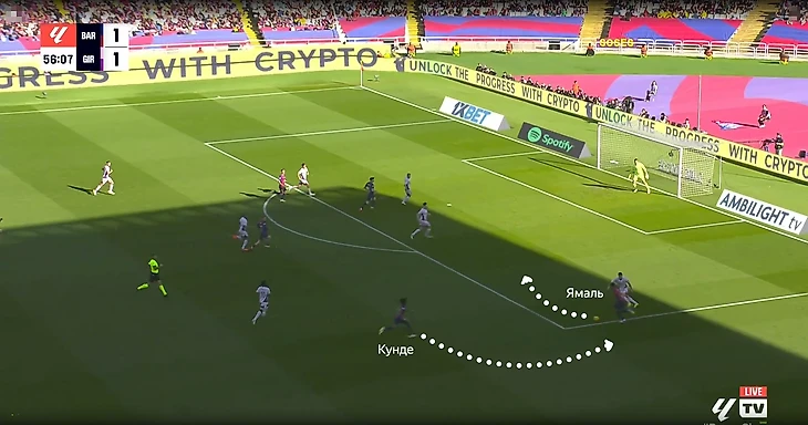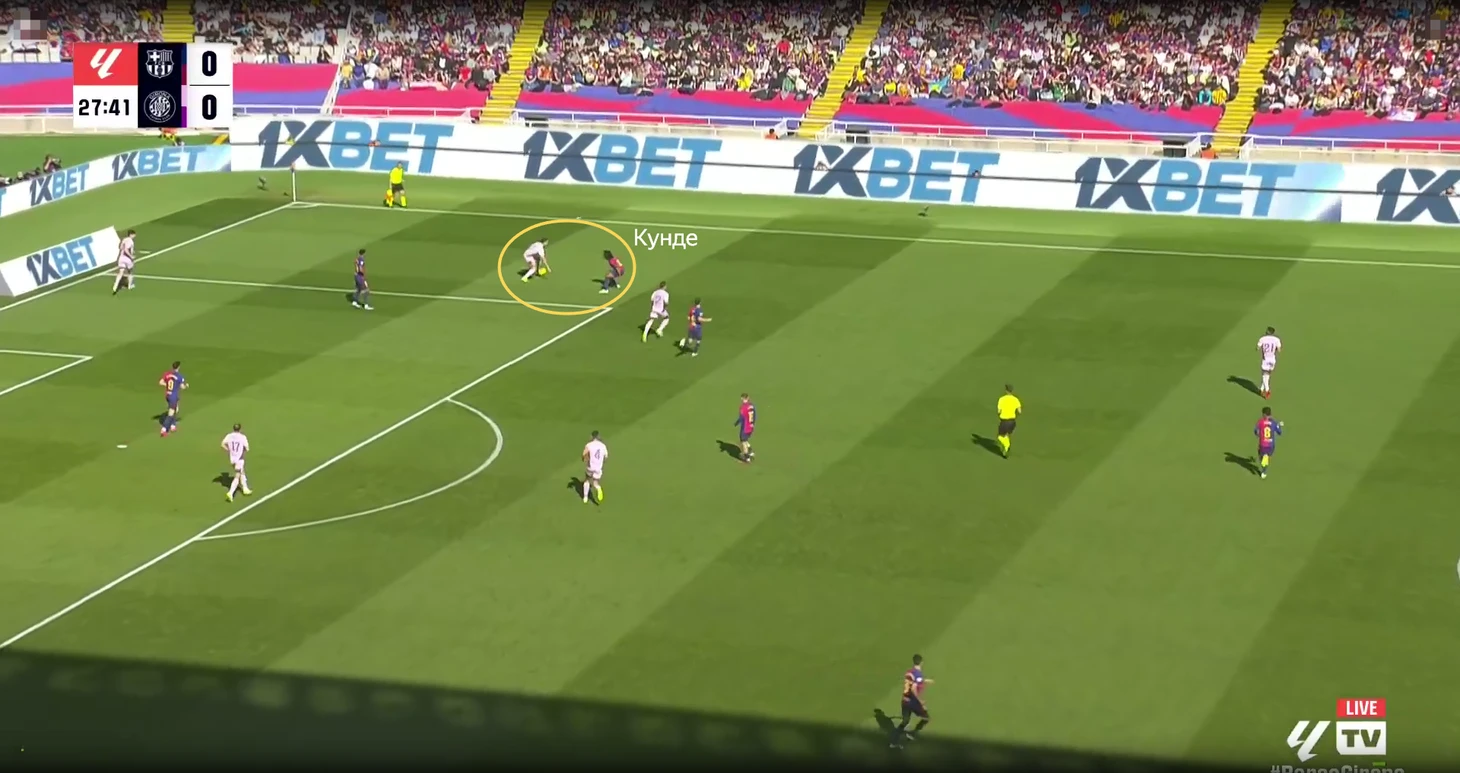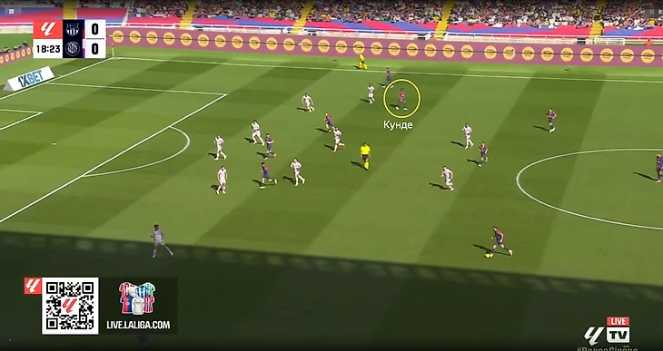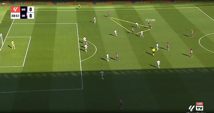 Впереди есть несколько вариантов развития событий (подробнее описывал здесь). Против «Жироны» Кунде неоднократно создавал опасность у чужих ворот подобным образом.