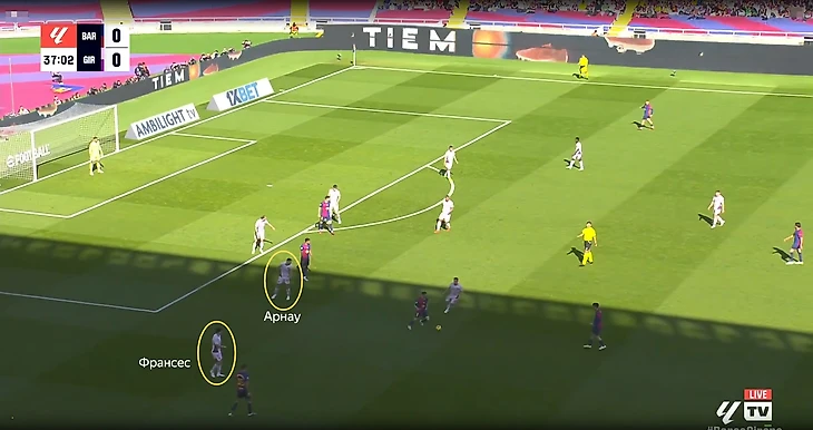 В случаях, когда мяч шел на фланг, на игрока «Барсы» выдвигался Франсес. В таких ситуациях его опускался страховать Мартинес.