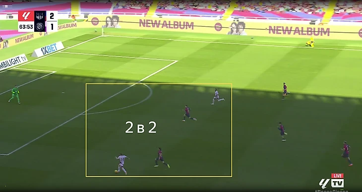 Именно оттуда пришли забитый мяч и несколько опасных моментов. Например, здесь команде Мичела удалось вытянуть игроков «Барсы» в прессинг, а затем в несколько передач выйти на чужую половину поля и довести атаку до ситуации два в два.