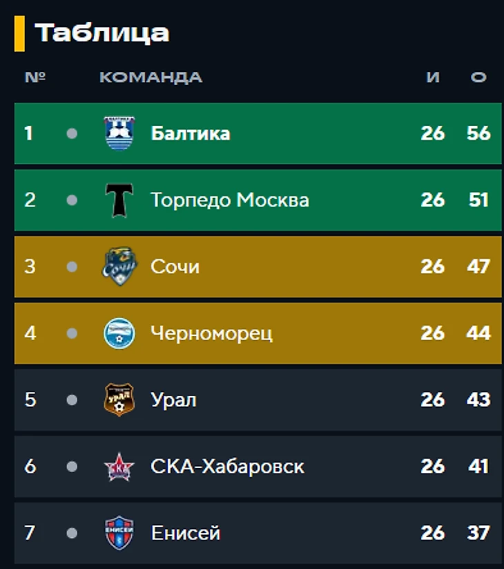 «Балтика» идет уверенно, «Сочи» ровно, Хабаровск вообще в порядке - четыре победы. А кому проиграл СКА? Дома «Торпедо», которое научилось выгрызать очки. Оранжево-черные же между вылетающей «Тюменью» и обнищавшей «Аланией», какая прелесть! Основная таблица развеивает иллюзии.