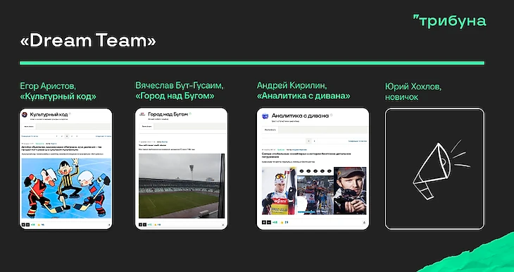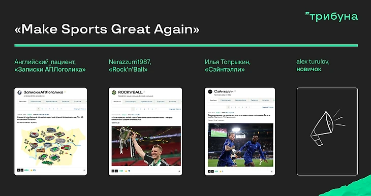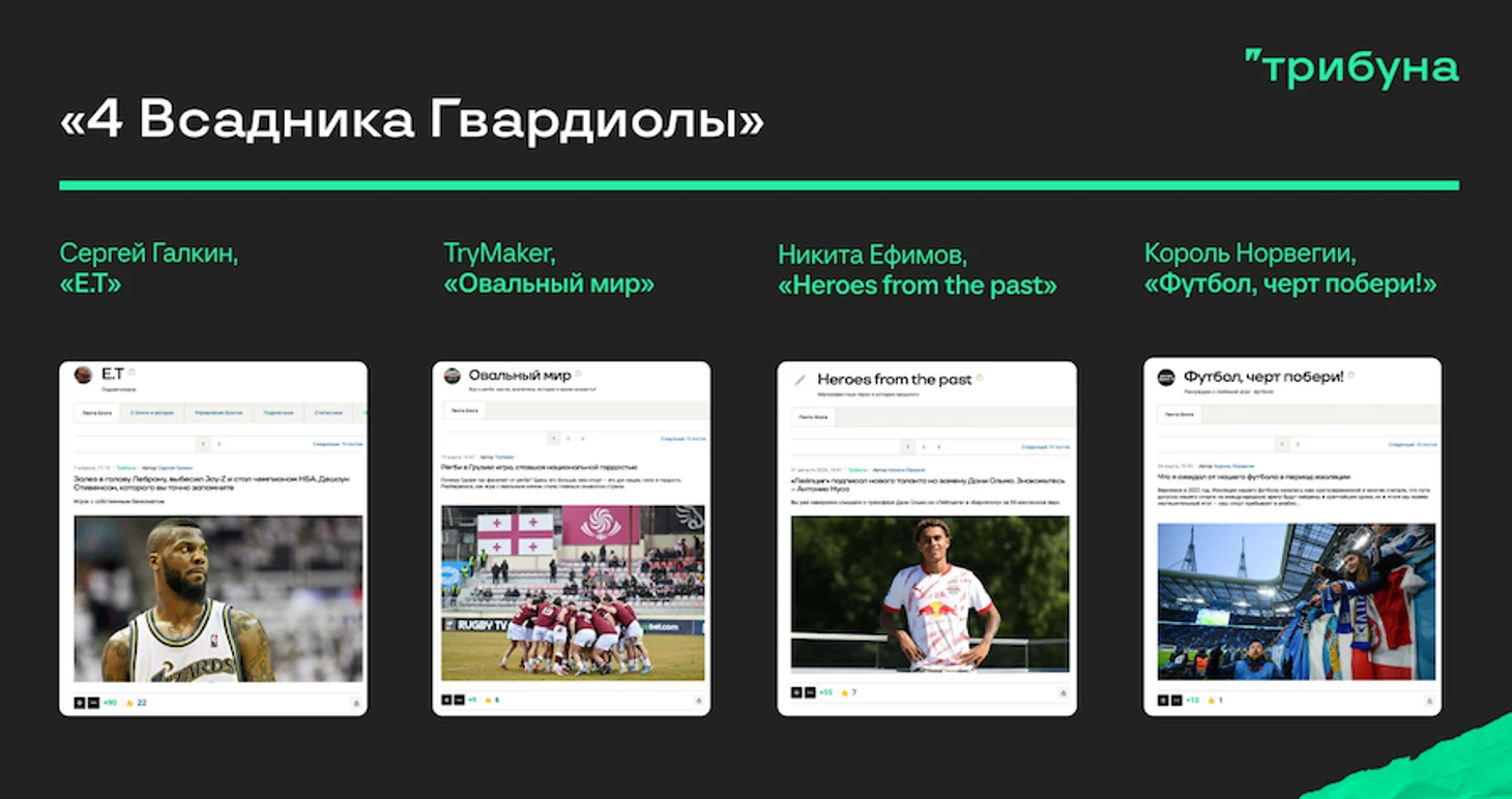 С сегодняшнего дня и до 19 апреля 14 команд будут соревноваться друг с другом на Трибуне, проявлять авторский талант и любовь к спортивному блогингу: каждой команде нужно написать четыре поста в четырех заявленных жанрах (репортаж, интервью, аналитика, профайл).