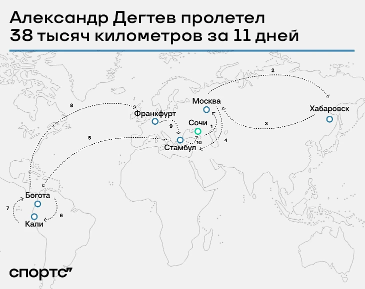 Александр Дегтев – 19-летний вратарь «Сочи» и молодежной сборной России. В марте он отправился в уникальное путешествие, облетев 40 тысяч километров (почти как длина экватора) за 11 дней ради матчей ФНЛ и молодежной сборной.
