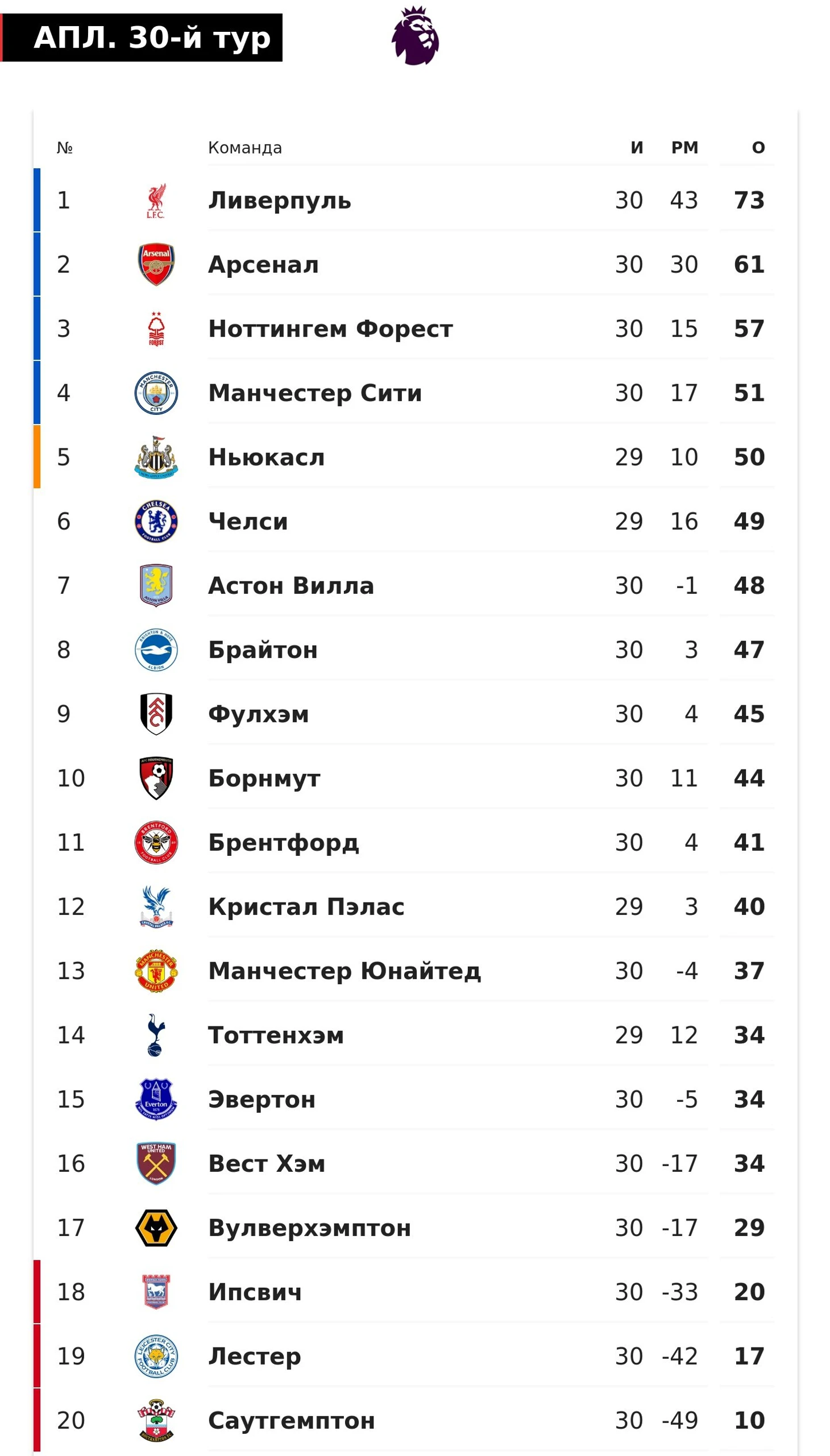 В красной зоне уже нет интриги: «Саутгемптон» в апреле вылетит официально, а «Лестер» присоединится. У «Ипсвича» после свежей победы очень скромные шансы остаться. Обратно в Чемпионшип поедут все трое только поднявшихся.