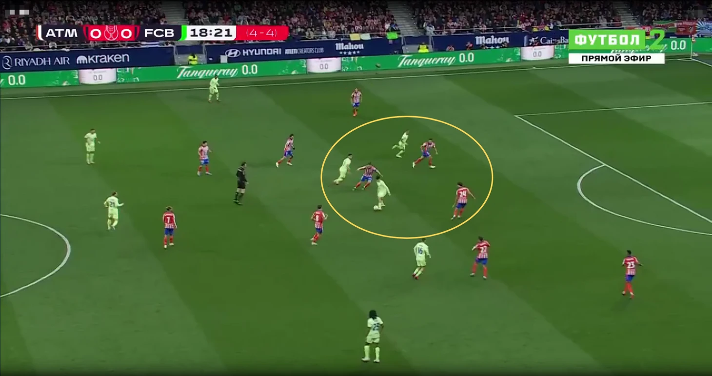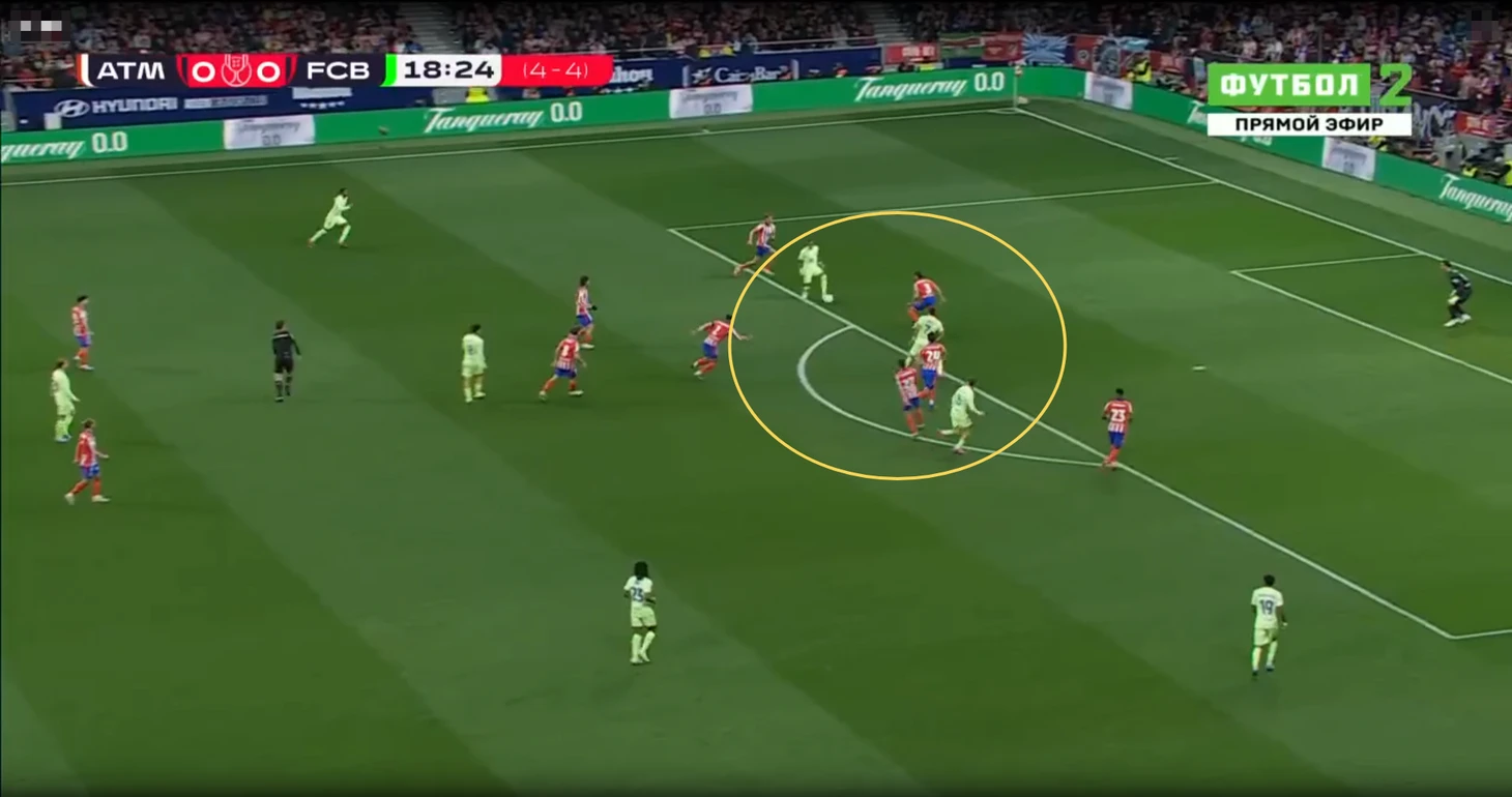 Благодаря этому гости получали возможность активно продвигать мяч через центр. Например, здесь Мартинес получает свободу на мяче из-за пассивности в прессинге «Атлетико».