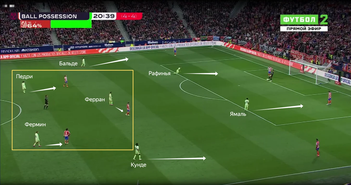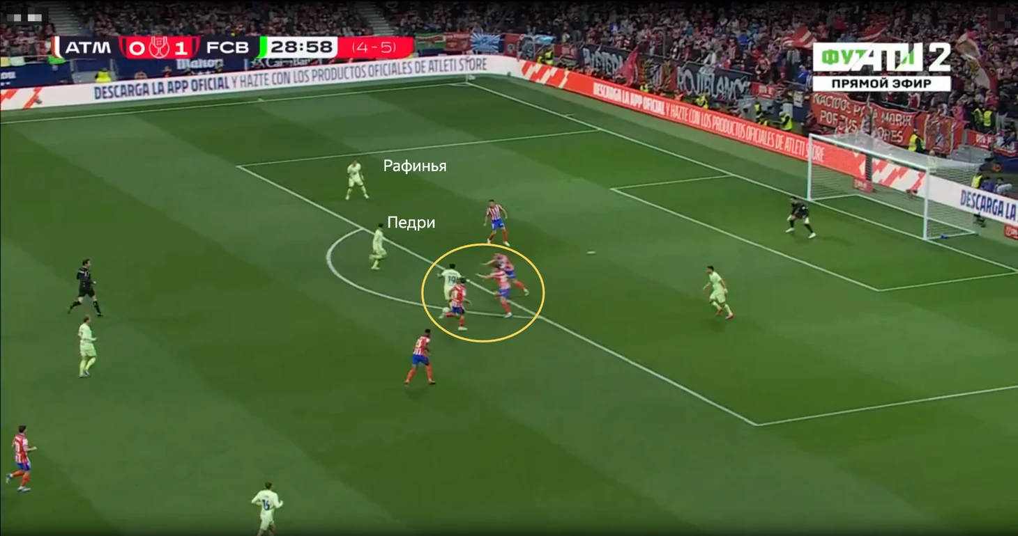 В опорной зоне открываются сразу три игрока «Барселоны». В результате Педри, Рафинья и Ферран втроем создали опасность у чужих ворот.