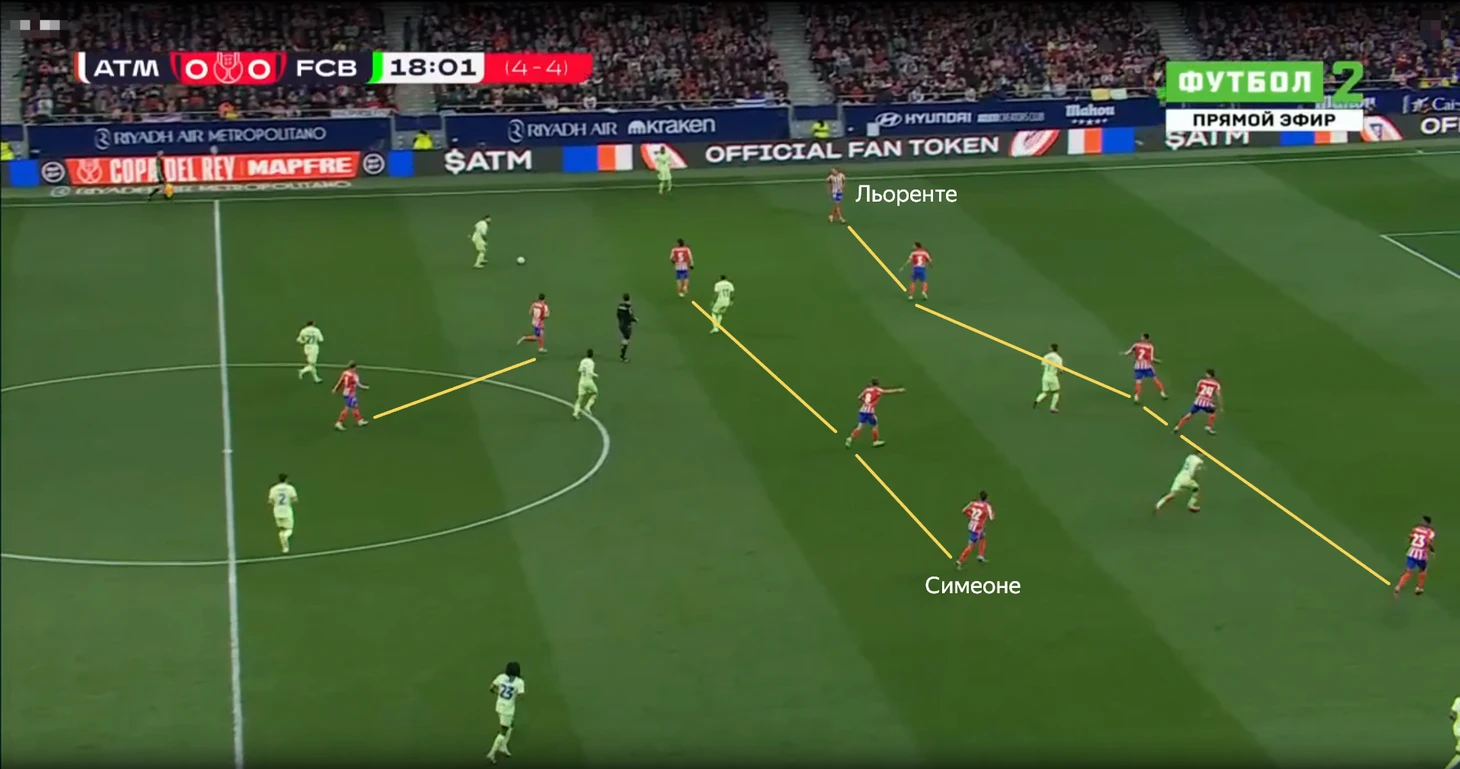 В такой ситуации правый фланг закрывал Льоренте. В стадии позиционной обороны «Атлетико» привычно переходил из среднего блока в схеме 4-4-2 на пятерку защитников за счет опускания Льоренте.