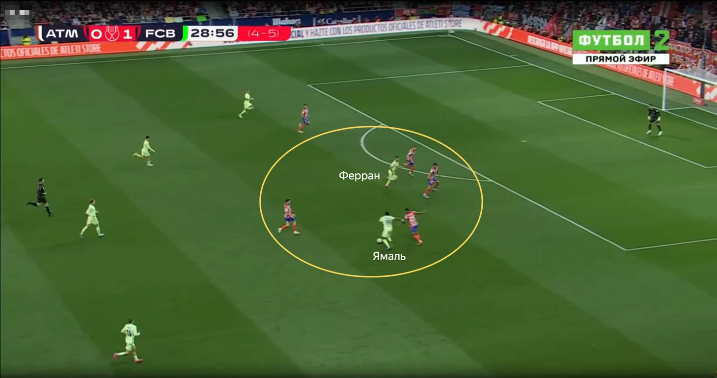Вот отличный пример с классной и по задумке, и по исполнению передачей Ямаля на Феррана. Для подобных эпизодов Торрес подходит лучше Левандовского. Ферран умеет здорово открываться в свободные пространства за спины защитникам соперника (Левандовски лучше действует внутри штрафной).