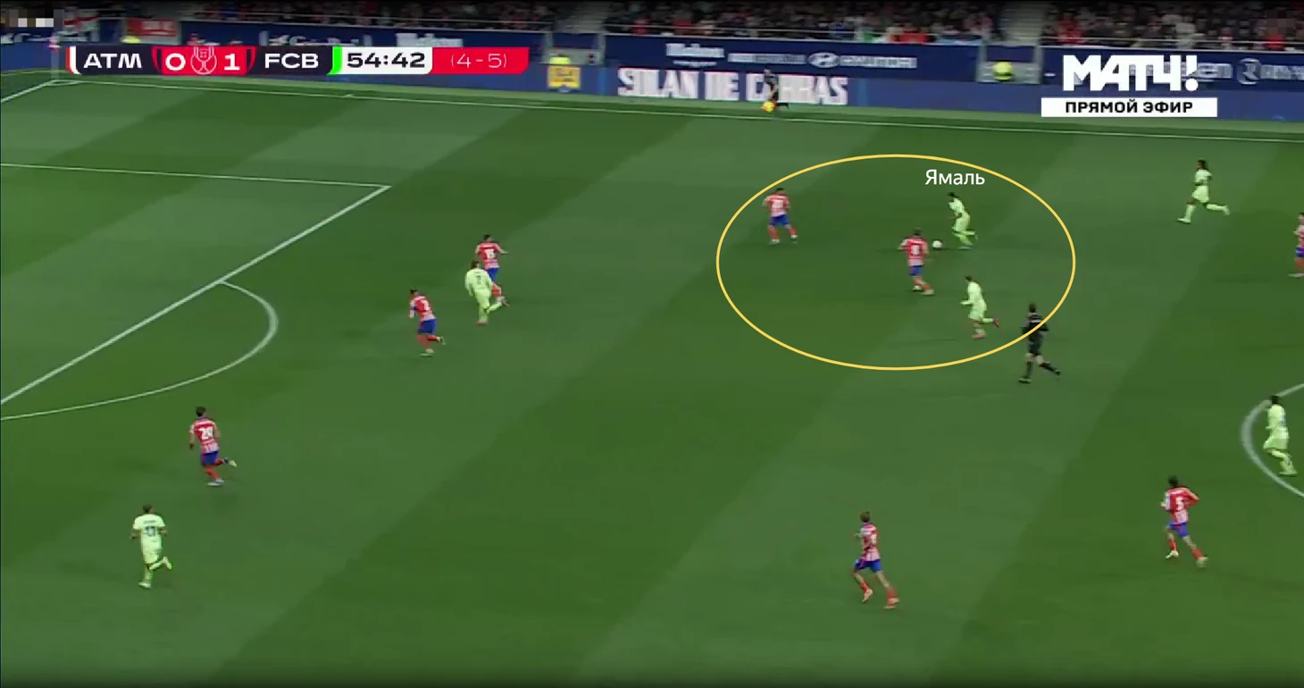 Также Ямаль зачастую обострял за счет своих проходов с мячом. Алгоритм следующий: Ламин получает мяч, видит свободную зону и врывается в нее. На него реагируют сразу несколько футболистов противоположной команды, что по цепочке дает свободу другим игрокам «Барсы». Вот несколько примеров, когда подобные действия приводили к голевым шансам каталонцев.