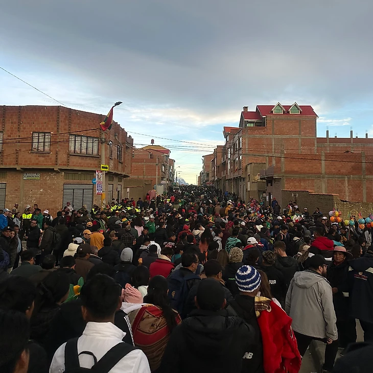 Больше часа в пути, мы уже на задворках Эль Альто. За окном все чаще мелькает разруха, мусор и бездомные собаки. Последний полицейский кордон, пора выходить. Куча атрибутики, народу и классический футбольный мандраж в воздухе.