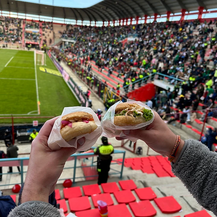 Иду на поиски перекуса, взял два сэндвича по десять боливиано каждый (~70 рублей) и кофе за пять. На стадионе в целом рандомная рассадка – где свободно, там и присаживайся. Поэтому ко второму тайму я перемещаюсь в самый центр для лучшего обзора.