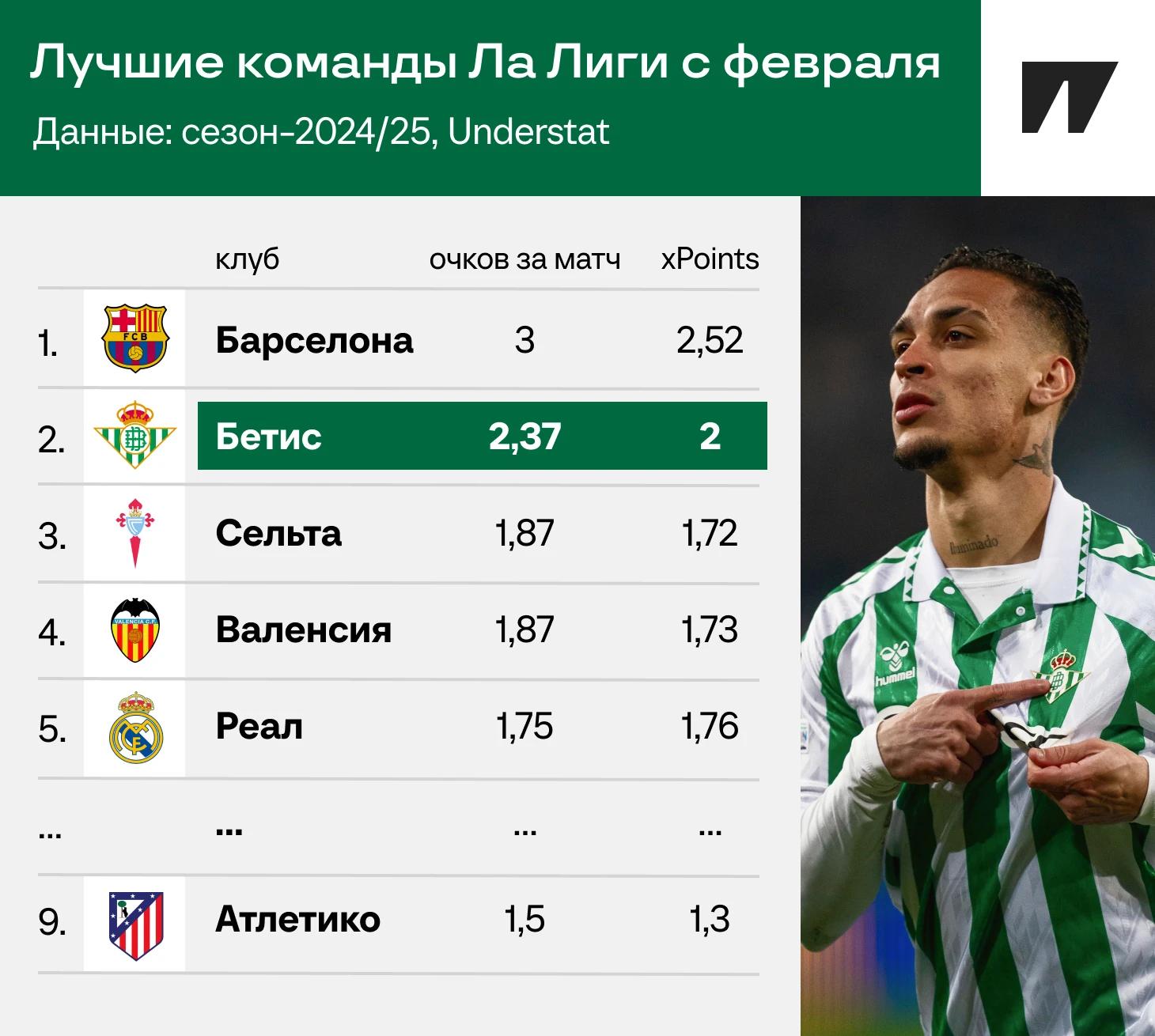 «Бетис» в горячей форме: с февраля не проигрывает в Ла Лиге и по среднему числу очков на этом отрезке идет вторым следом за «Барселоной». Нет, это не розыгрыш: после прихода Антони (или после зимнего трансферного окна) так хороши.