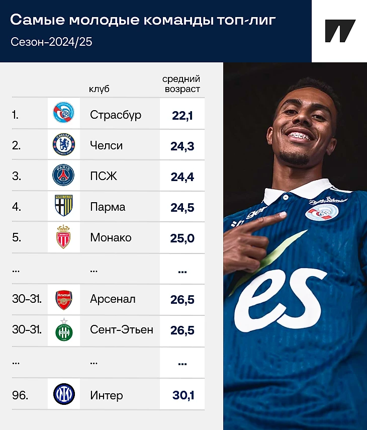 «Страсбур» младше «Челси», старшего английского брата, на 2,2 года. Это колоссальный разрыв. Для контекста: 2,2 года отделяют «Челси» от «Арсенала» и «Сент-Этьена», которые делят 30-е и 31-е места. То есть отрыв первого места от второго, как отрыв второго места от 30-го/31-го.