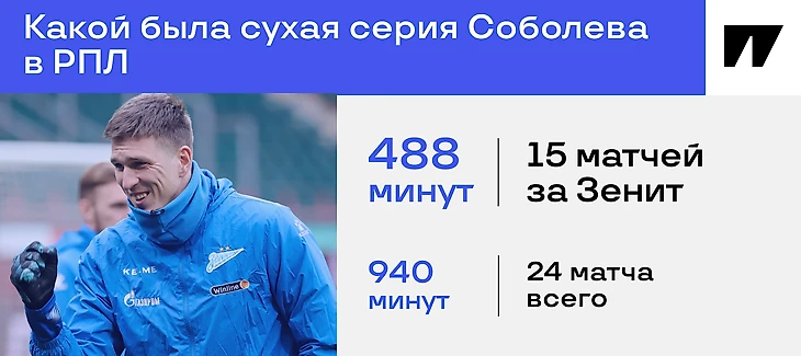 ● С того момента в восьми оставшихся матчах сезона-2023/24 Соболев не забивал – только отметился ассистом против «Ростова». В 16 играх нового сезона (одна за «Спартак», еще 15 – за «Зенит») тоже не забил.