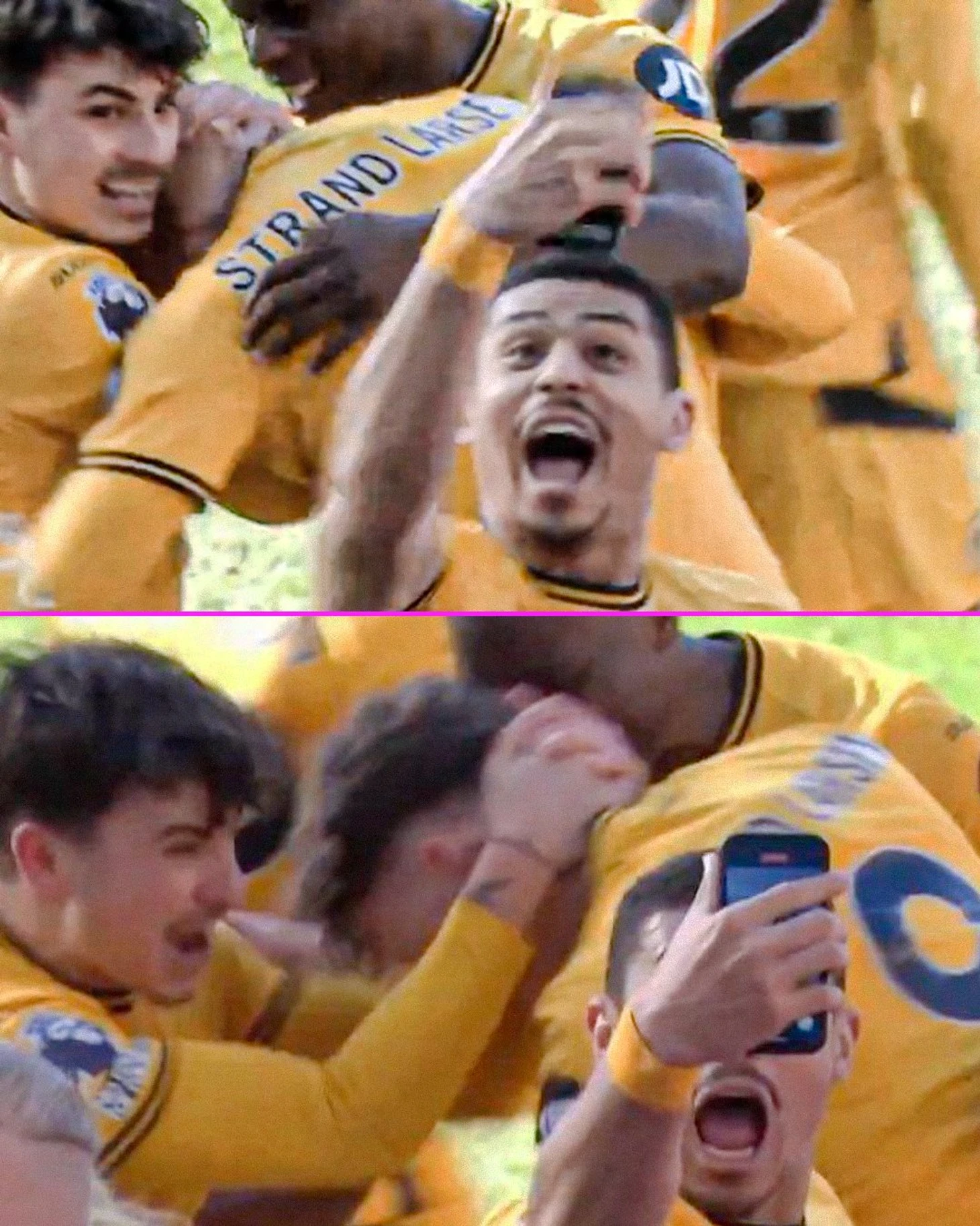 В игре был еще один забавный момент, но уже от игроков «Вулверхэмптона». Андре Нето на радостях от позднего победного мяча его команды выхватил у болельщика телефон и сделал селфи.