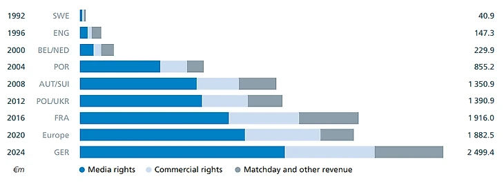 В cash&goals уже был материал про ожидаемые рекордные доходы от Евро24, прогноз подтвердился - выручка выросла на треть до 2,5 млрд. Конечно, не совсем корректно сравнивать с ковидным Евро20, но все-таки рост отмечается по всем компонентам.
