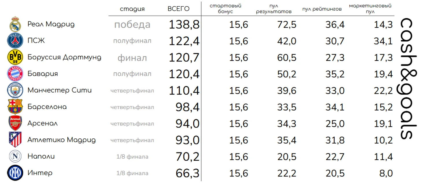 Отдельно рассмотрим выплаты клубам в еврокубках. Ранее в cash&goals уже был материал с разбором выплат, но это были расчетные показатели, в отчете представлены фактические суммы.