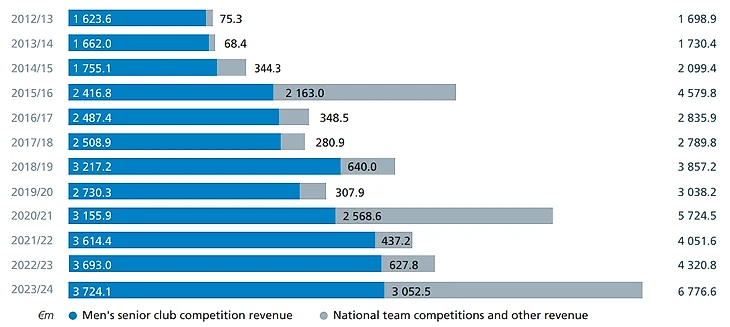Совокупный доход организации вырос до 6 776,6 млн евро (+2 455,8 млн). Это исторический рекорд. Но резкий рост объясняется проведением Евро24, выручка от клубных соревнований выросла только на 31 млн (+0,8%). Здесь тоже все логично, доходы УЕФА зависят от трехлетних ТВ контрактов и внутри этого цикла меняются незначительно.