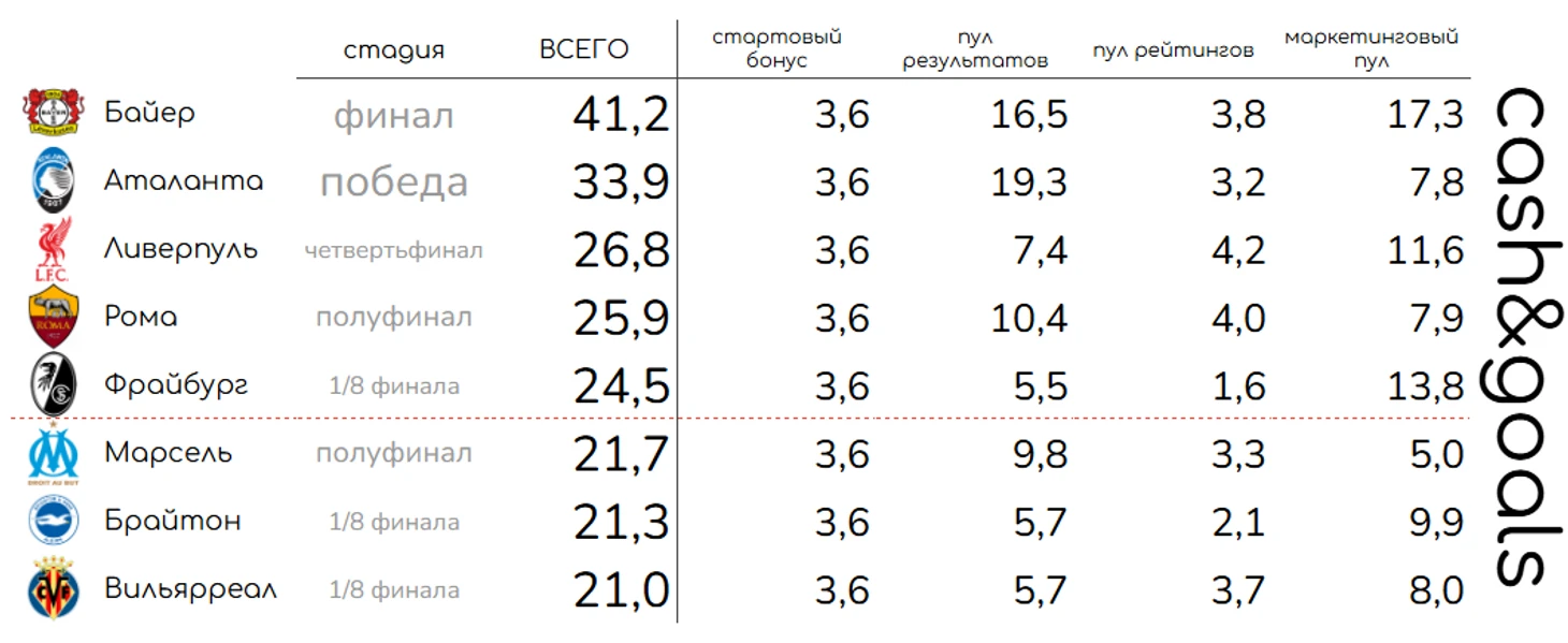 В Лиге Европы ситуация иная. Байер уступил в финале Аталанте, но заработал больше - 41,2 млн против 33,9 млн. Все благодаря маркетинговому пулу (сумма выплат зависит от стоимости продажи ТВ прав турнира на рынке каждой страны). Больше худшего участника ЛЧ во втором по значимости турнире смогли заработать только 5 клубов, еще 3 клуба заработали сопоставимые суммы.
