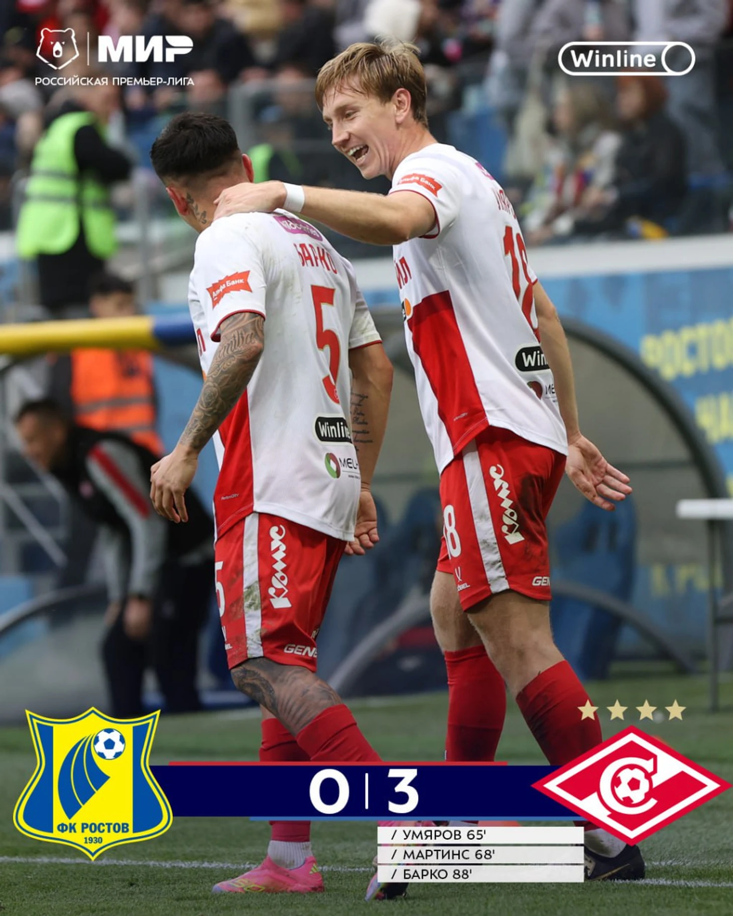 «Спартак» на выезде победил «Ростов» в матче 23-го тура РПЛ — 3:0.