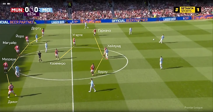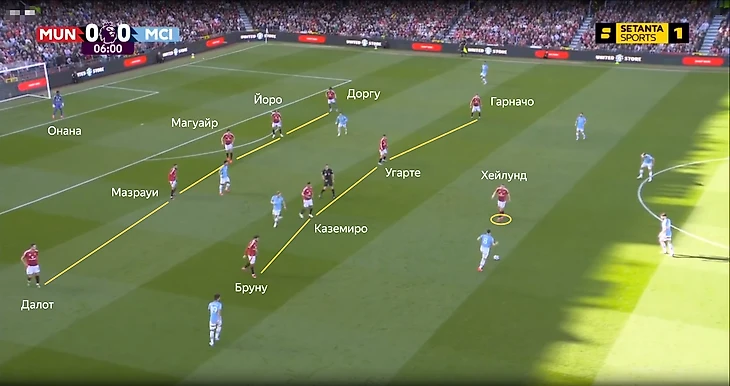 В плане схеме при обороне хозяева не преподнесли каких-либо сюрпризов: вышли по привычной формации 5-2-3. При этом по ходу развития атак соперника «Юнайтед» переходил на 5-4-1 за счет опускания в центральную линию Бруну и Гарначо.