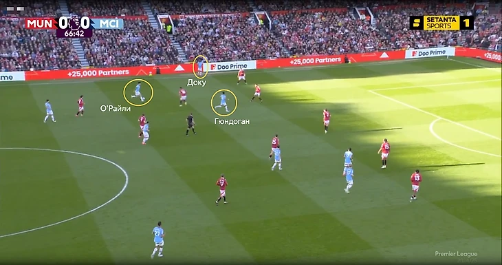 Еще по ходу второго тайма Пеп пытался добавить команде обострения впереди. На поле появился Доку. Жереми занимал более широкую позицию, чем Фоден. Позицию в полуфланге в это время занимал Гюндоган. Ниже действовал О’Райли.