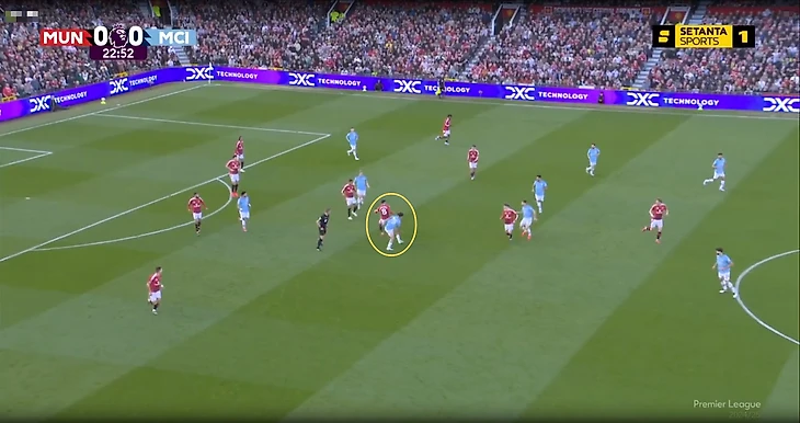 Бруну вышел как правый инсайд, но обладал свободой перемещений и мог оказываться на тех участках поля, где это было необходимо. Например, здесь «МЮ» вышел в атаку именно за счет открывания португальца в свободной зоне между линиями (снова вспомним совет про позицию судьи).