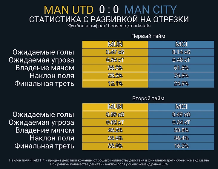 Во втором тайме кардинально изменились некоторые показатели команды Гвардиолы. «Сити» стал меньше (по сравнению с первым таймом) владеть мячом (61.8% против 53.8%) и заметно уступил контроль территории (наклон поля: 76.8% против 36.4%).