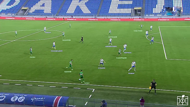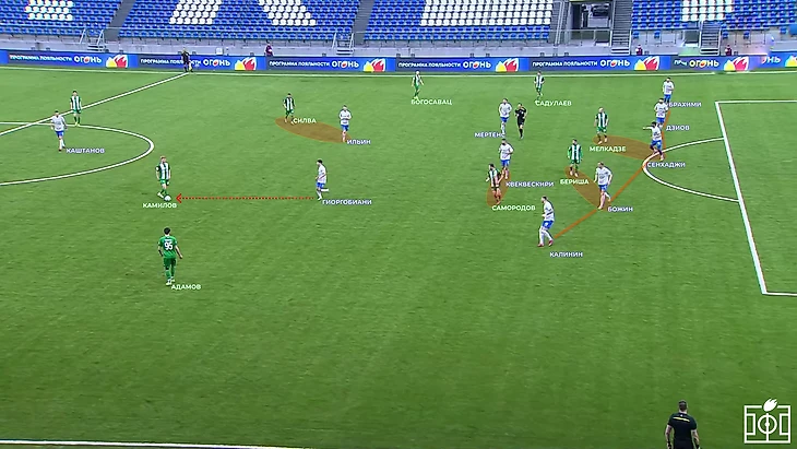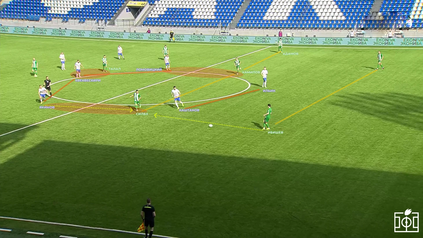 В редкие моменты попыток давления при розыгрыше мяча со стороны соперника команда перестраивалась в 3-4-3: Александр Ломовицкий поднимался выше, в зону опорного полузащитника «Ахмата», закрывая его как опцию для передачи.
