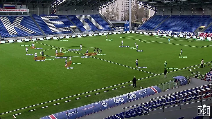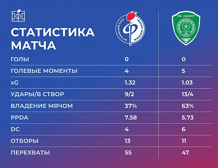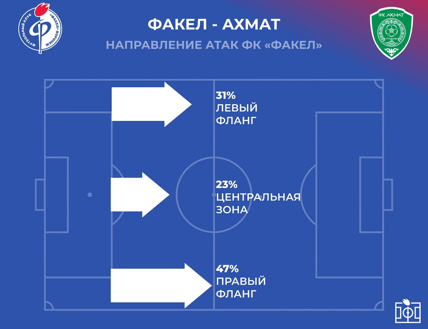 В целом, «Факел» провёл качественный первый тайм, лишив атакующую группу «Ахмата» пространства и возможности вести позиционные атаки через короткий и средний пас.